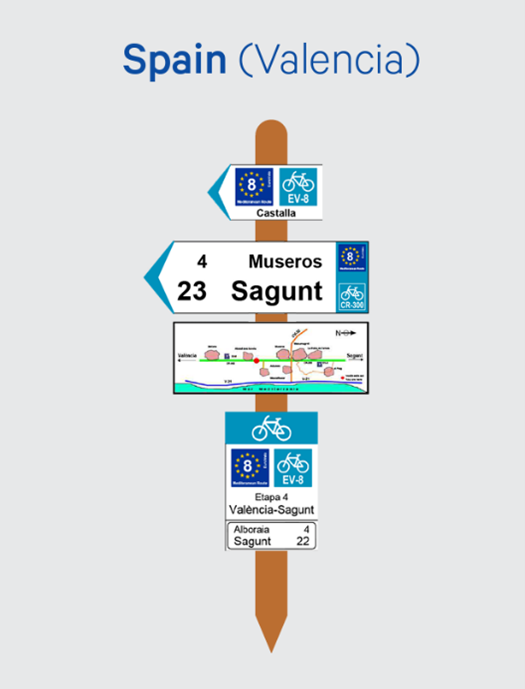 Específicamente, las etapas de Eurovelo 8 son 42, de las cuales 10 son en la Comunidad Valenciana. Además, es la ruta nacional que más presencia tiene en el territorio valenciano, con 512 km de longitud, ya que en todo momento está guiada por el mar Mediterráneo.