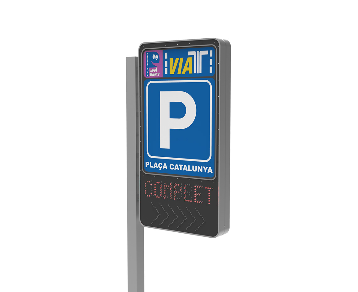 Señal electrónica para la indicación de disponibilidad de plazas de parking. Permite a los conductores la rápida detección de plazas libres en las ciudades, reduciendo el estrés en la conducción y evitando aglomeraciones en el interior de los parkings.